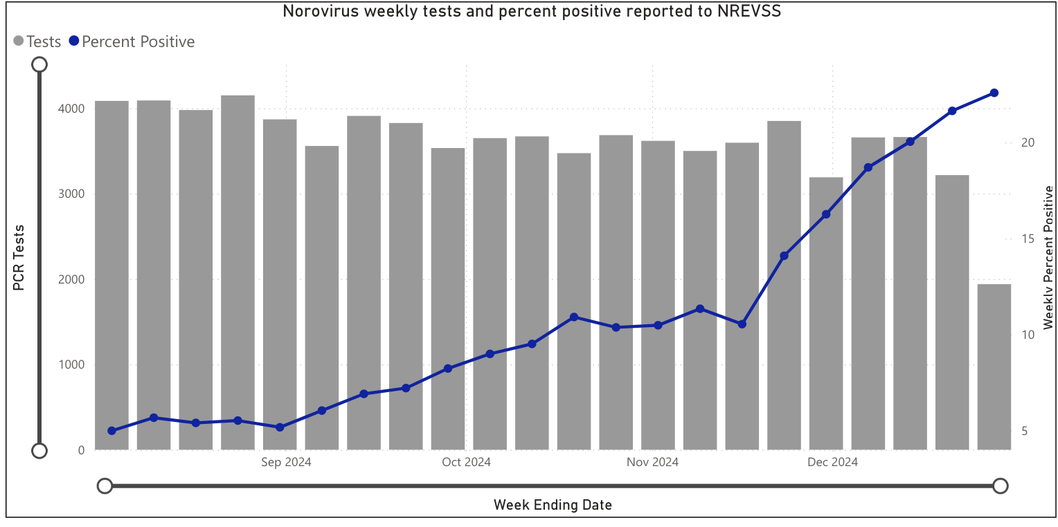 Recent CDC data shows a significant increase in norovirus cases across the US, with over 22% of tests returning positive as of December 2024.