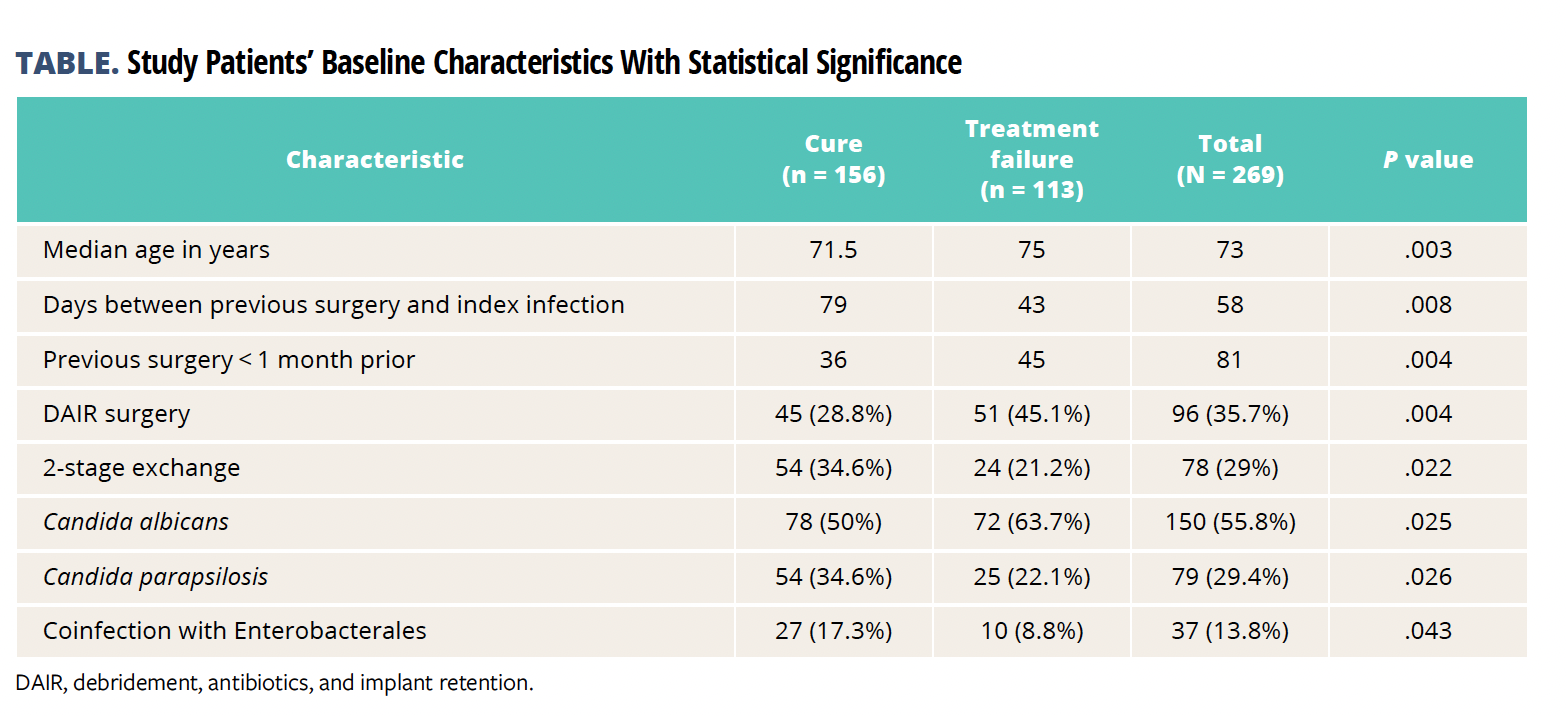 Candida PJIs represent a diagnostic challenge because fever rarely occurs in these patients, and single specimens growing Candida may be considered a contaminant. To date, there are no established guidelines for the treatments of fungal PJIs, possibly due to their rare incidence and challenges in accurate diagnosis.1 Polymicrobial PJIs are also possible, and past cases have shown that 15% to 20% of fungal PJIs may have concurrent bacterial infections.1 Systemic reviews of the literature have been published; however, the quality of evidence is still limited by the availability of case reports, small case series, and very small retrospective cohorts.1,2,4-9 Therefore, the optimal medical and surgical management, choice of antimicrobials, and duration of treatment for fungal PJIs remain uncertain. In the setting of a general lack of highquality literature on the management of candidal PJIs, Dinh et al conducted a large, retrospective, multinational observational cohort study to bridge this gap.10 This study evaluated patients diagnosed with Candidarelated PJI across 19 hospitals from 7 countries from 2010 to 2021. Patients who met European Bone and Joint Infection Society PJI criteria, had Candida spp in 2 or more sterile samples, and had clinical signs and symptoms of PJI such as fever, pain, or other inflammatory indicators were included. In terms of outcomes, the cohort was divided into cure and treatment failure groups, where the cure was defined as not having any signs and symptoms of infection after 2 years of follow-up and treatment failure was defined as a composite of relapse/recurrence, need for suppressive treatment, or death. Overall, 269 patients were included in the cohort; 10.8% had immunocompromised status, and 75.8% had previous infection at the same site. Statistically significant baseline patient characteristics are summarized in the TABLE.
