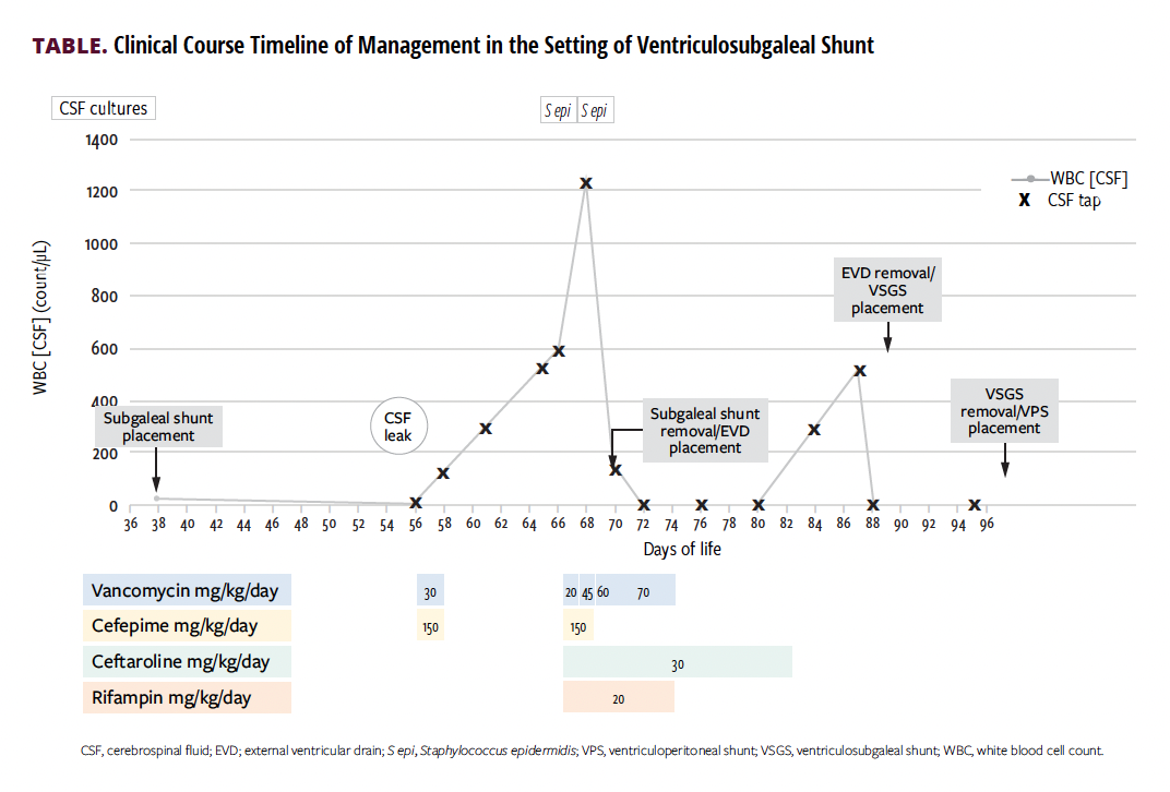 The patient’s course became complicated on day 56 by a cerebrospinal fluid (CSF) leak at the site of the subgaleal shunt, prompting a 48-hour course of cefepime and vancomycin; these were discontinued following negative CSF culture results. The subgaleal fluid collection was subsequently addressed with serial lumbar punctures. As illustrated in the FIGURE, critical clinical events unfolded over the subsequent weeks. On day 66, the patient’s condition deteriorated as he developed hypoxic hypercarbic respiratory failure, requiring intubation. Vancomycin and cefepime were reintroduced, and CSF analysis showed elevated white blood cell count, high protein levels, and low glucose level, though Gram stain result was negative. CSF culture results were positive for S epidermidis within 24 hours, revealing resistance to oxacillin and trimethoprim/sulfamethoxazole but susceptibility to rifampin.