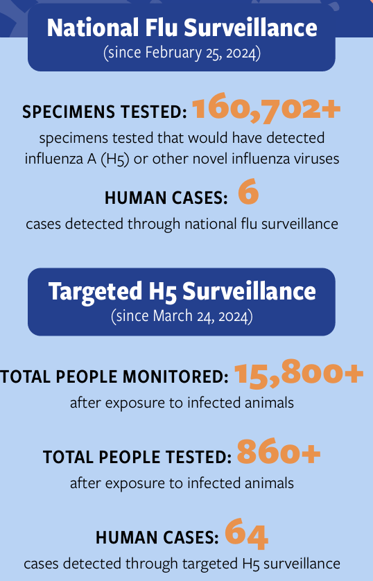From the beginning, the US has been on the back foot regarding surveillance for H5N1, which means it is vital that widespread efforts are made to increase testing. From additional wastewater surveillance sites to testing in higher-risk workers and economic protections for farmers/workers, there are steps we can take now to improve our stance in this outbreak.7