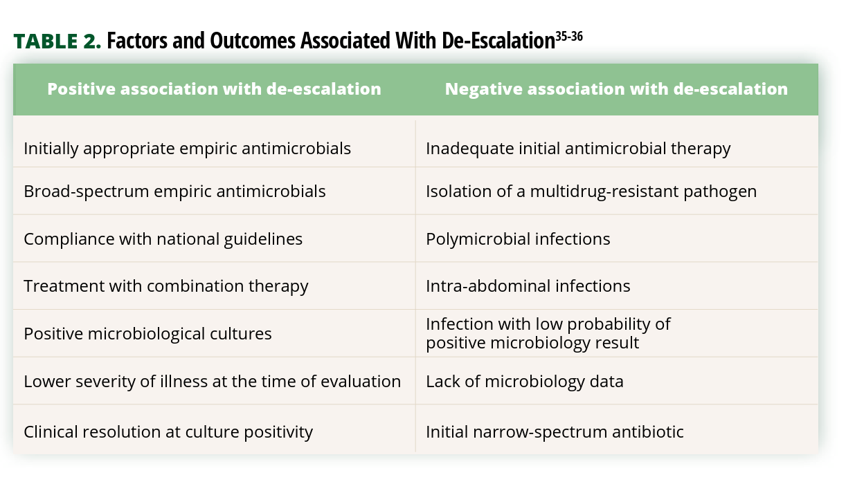 The 2021 Surviving Sepsis guidelines recommend that due to the “adverse societal and individual risks to continued unnecessary antimicrobial therapy, thoughtful de-escalation of antimicrobials based on adequate clinical improvement is appropriate even if cultures are negative.” De-escalation is also considered safe based on systematic reviews and meta-analyses assessing outcomes of clinical complications or adverse events.5,9 TABLE 1 summarizes the advantages of de-escalation.
